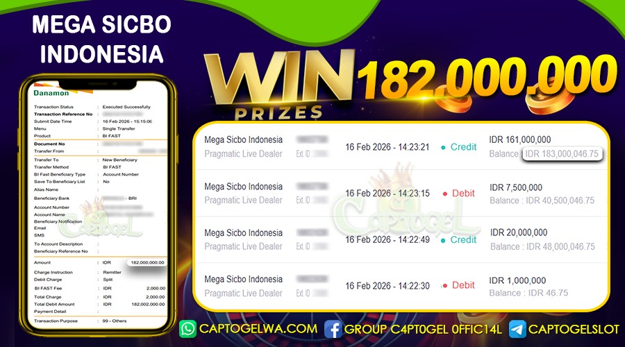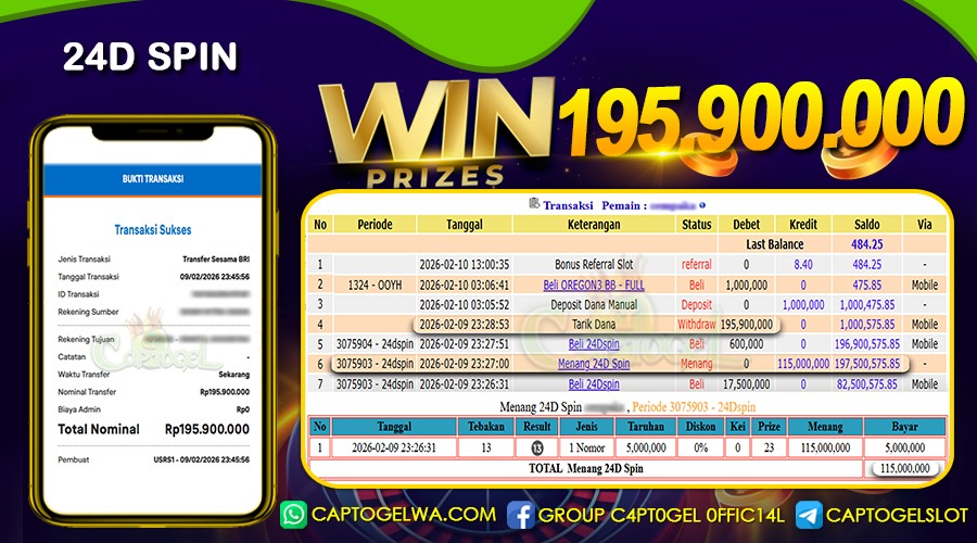 Beberapa situs togel online hanya menjanjikan tanpa ada bukti yang jelas, tapi di CAPTOGEL semua pasti terbukti dan jelas, BUKTI JACKPOT TOGEL ONLINE, SLOT ONLINE & LIVE CASINO secara nyata. Melalui kemenangan member setiap hari nya, jackpot besar togel online 2Dā3Dā4D maupun jackpot besar slot gacor, hingga bukti transaksi kemenangan yang benar-benar masuk ke saldo member.